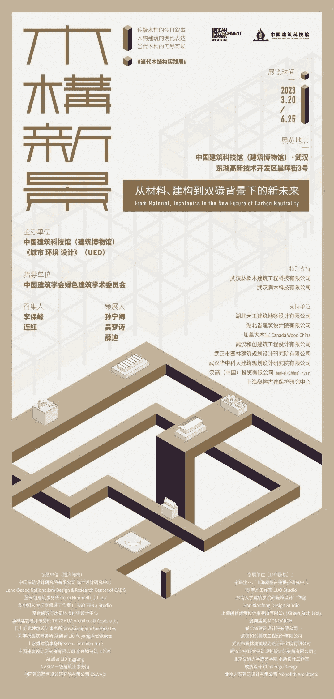 由湖北天工建筑勘察設計有限公司牽頭支持,李保峰大師召集,《城市 環境 設計》雜志和中國建筑科技館主辦的“木構新景:當代木結構實踐展”將于3月20日至6月25日在武漢中國建筑科技館舉辦,主題是:從材料、建構到雙碳背景下的新未來!