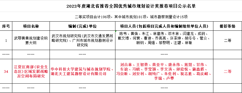 2023年11月30日,湖北省城市規(guī)劃協(xié)會(huì)公示了2023年度湖北省推薦全國優(yōu)秀城市規(guī)劃設(shè)計(jì)獎(jiǎng)推薦項(xiàng)目名單,湖北天工建筑勘察設(shè)計(jì)有限公司聯(lián)合華中科技大學(xué)完成的“江夏區(qū)南部(農(nóng)業(yè)生態(tài)區(qū))區(qū)域發(fā)展戰(zhàn)略及空間布局研究”項(xiàng)目榮獲二等獎(jiǎng),并計(jì)劃申報(bào)國家級(jí)獎(jiǎng)項(xiàng)!(撰稿人:李媛)