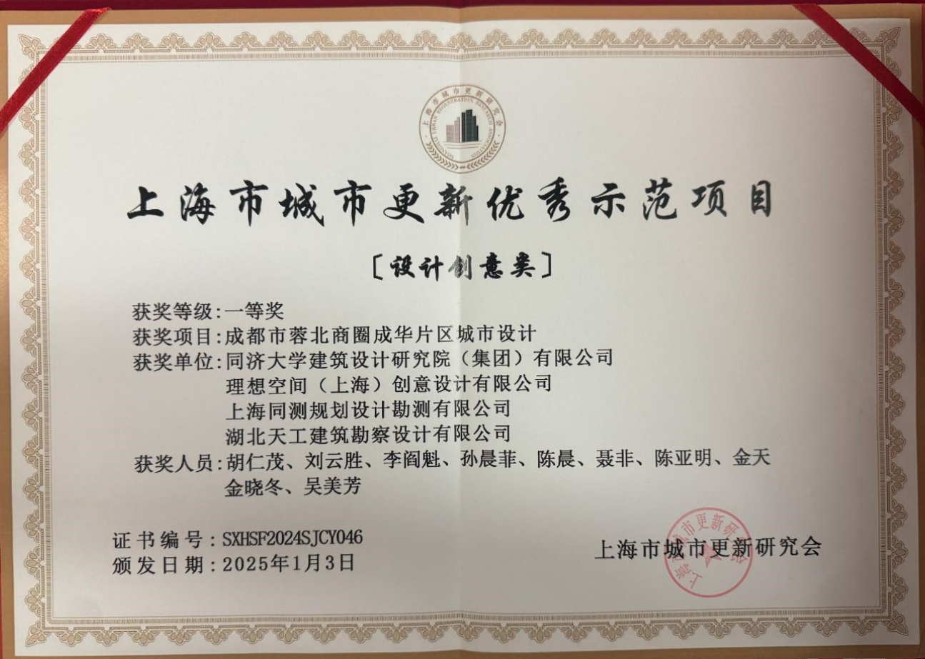 天工院聯(lián)合同濟大學建筑設計研究院(集團)有限公司、理想空間(上海)創(chuàng)意設計有限公司、上海同測規(guī)劃設計勘測有限公司設計的成都市蓉北商圈成華片區(qū)城市設計項目獲上海市城市更新優(yōu)秀示范項目(設計創(chuàng)意類)一等獎。